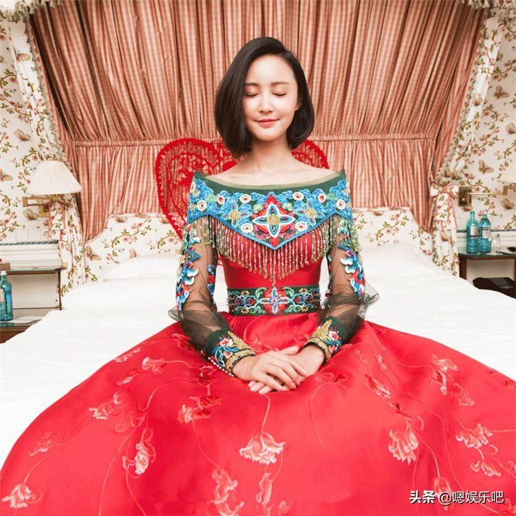 婚礼的抢亲环节安排在当地复古文艺的酒店中,新娘张歆艺当天身着某高定定制的中式礼服,领口的刺绣特写灵感来自明代的凤冠点翠,一袭复古的大红色长裙加上绣制、镶嵌的珍珠宝石,用细彩金立体刺绣耗时3个月纯手工绣制;整体造型古典优雅,高贵华丽。