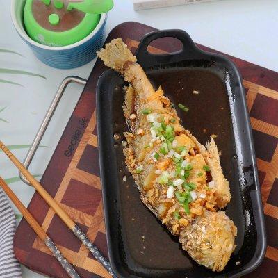 8、接着锅里面留少许的底油,把料汁都倒入,小火加热下最好加入几滴的熟油直接淋在炸好黄鱼身上就可以了。