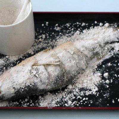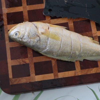 3、黄鱼洗干净去内脏,这个卖家一般会帮忙处理,然后用盐、面粉和水浸泡片刻冲洗干净,接着在表面划3-4刀(根据鱼的大小,而且深度要到一半),抹上盐和胡椒粉腌制15分钟左右。