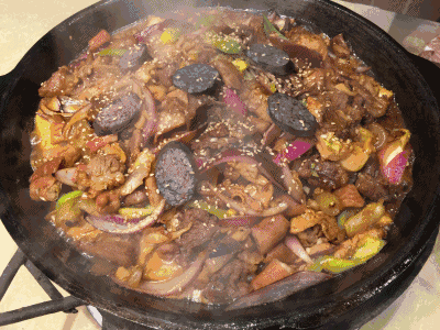 初看,热气腾腾,香烟袅袅、香气扑鼻的高丽火盆,不过是猪肉、牛肉、菌类、青菜的大杂烩,烩菜而已。